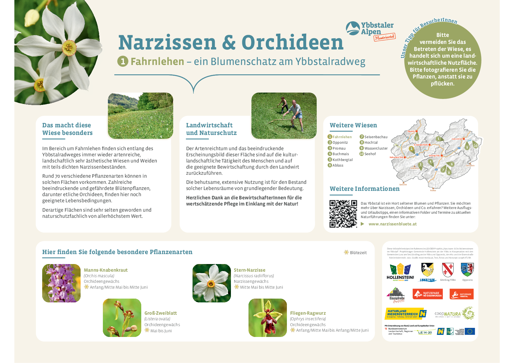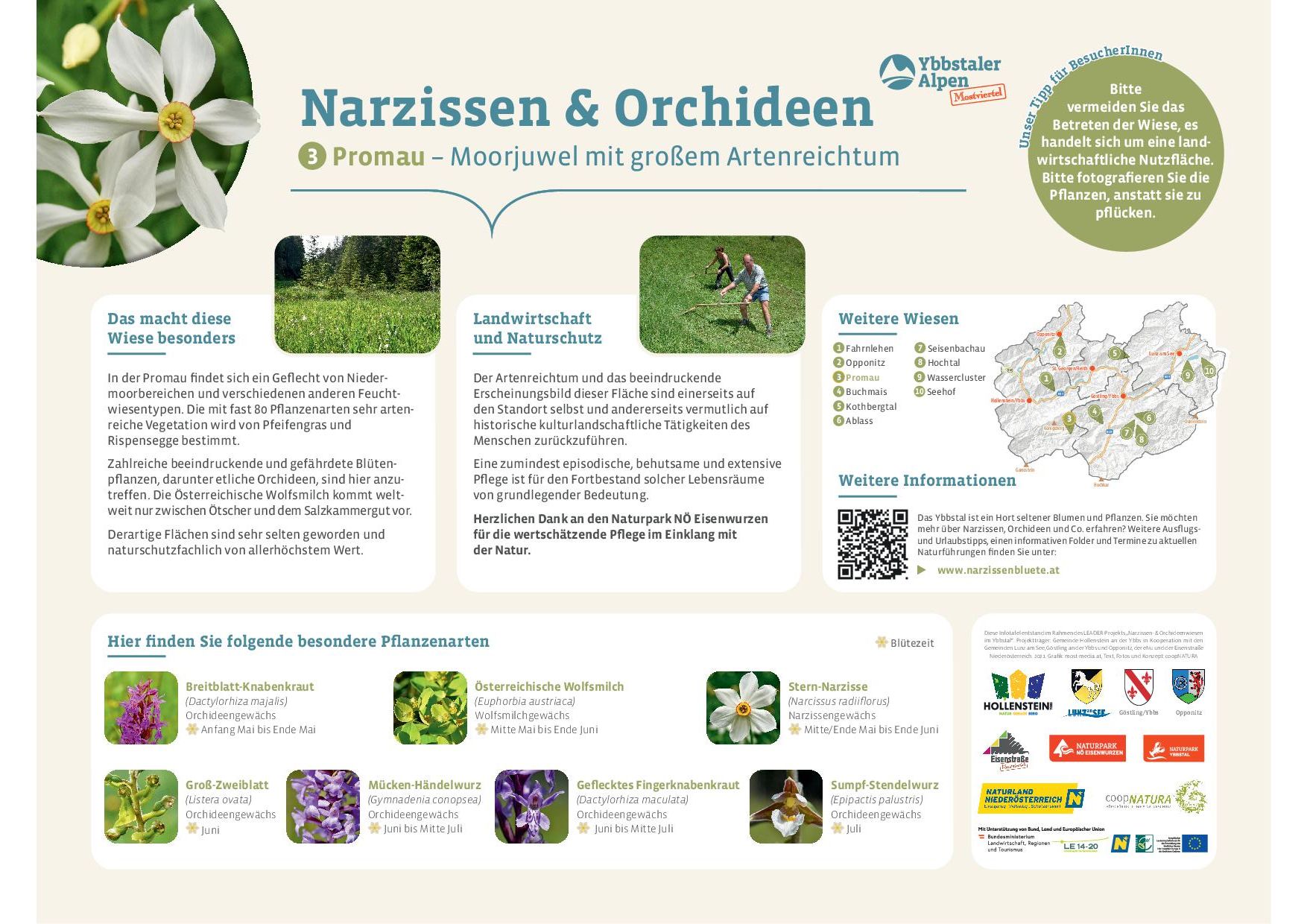 Die Gemeinden Hollenstein an der Ybbs, Göstling an der Ybbs, Lunz am See und Opponitz setzen sich gemeinsam mit der LEADER-Region Eisenstraße Niederösterreich, der Schutzgebietsbetreuung Mostviertel sowie uns als Naturpark – in Kooperation mit ENU und CoopNatura – für den Erhalt dieser wertvollen Naturlandschaften ein. Informative Schautafeln und Einblicke vor Ort machen die Bedeutung dieser artenreichen Wiesen sichtbar.
