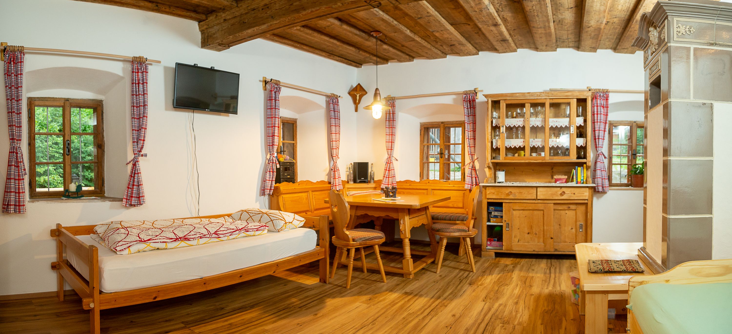 Die drei renovierten Ferienwohnungen am Hof besitzen altehrwürdigen Charakter und bieten Platz für bis zu jeweils fünf Personen. Gerne erhalten die Gäste am Ferienhof Einblicke in den Tagesablauf eines Bauerhofes. Die Gegend rund um den Hof lädt zu ereignisreichen MTB-Touren wie der Täler-Tour ein.